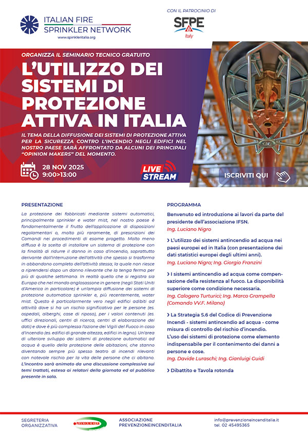 ITALIAN FIRE SPRINKLER NETWORK vi invita a partecipare in streaming al seminario tecnico che si terrà a Milano il 28 Novembre 2025 in collaborazione con PrevenzioneIncendItalia.